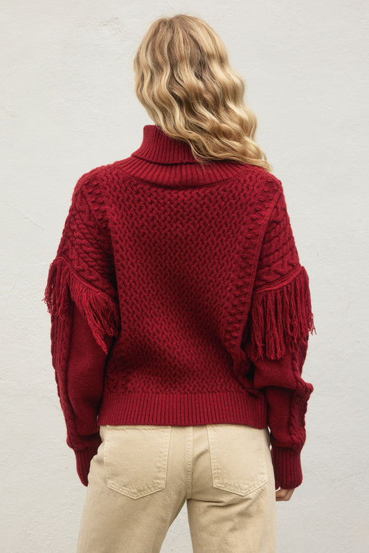 Turtleneck Fringe Accent Cable Knit Sweater