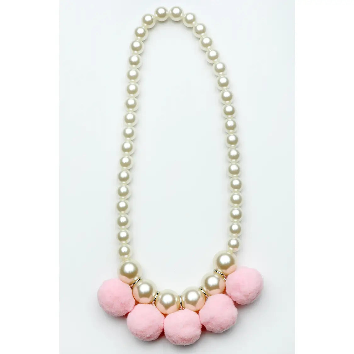 Introducing the Pom Pom Necklace from Sparkle Sisters by Couture Clips. This unique accessory features a pearl necklace on elastic, adorned with hanging Pom Poms, adding a playful touch to any outfit. it reflects our brand's commitment to providing fashionable options for children. This necklace is sure to bring joy and sparkle to your little one's day! This can be paired with so many different things over and over again!