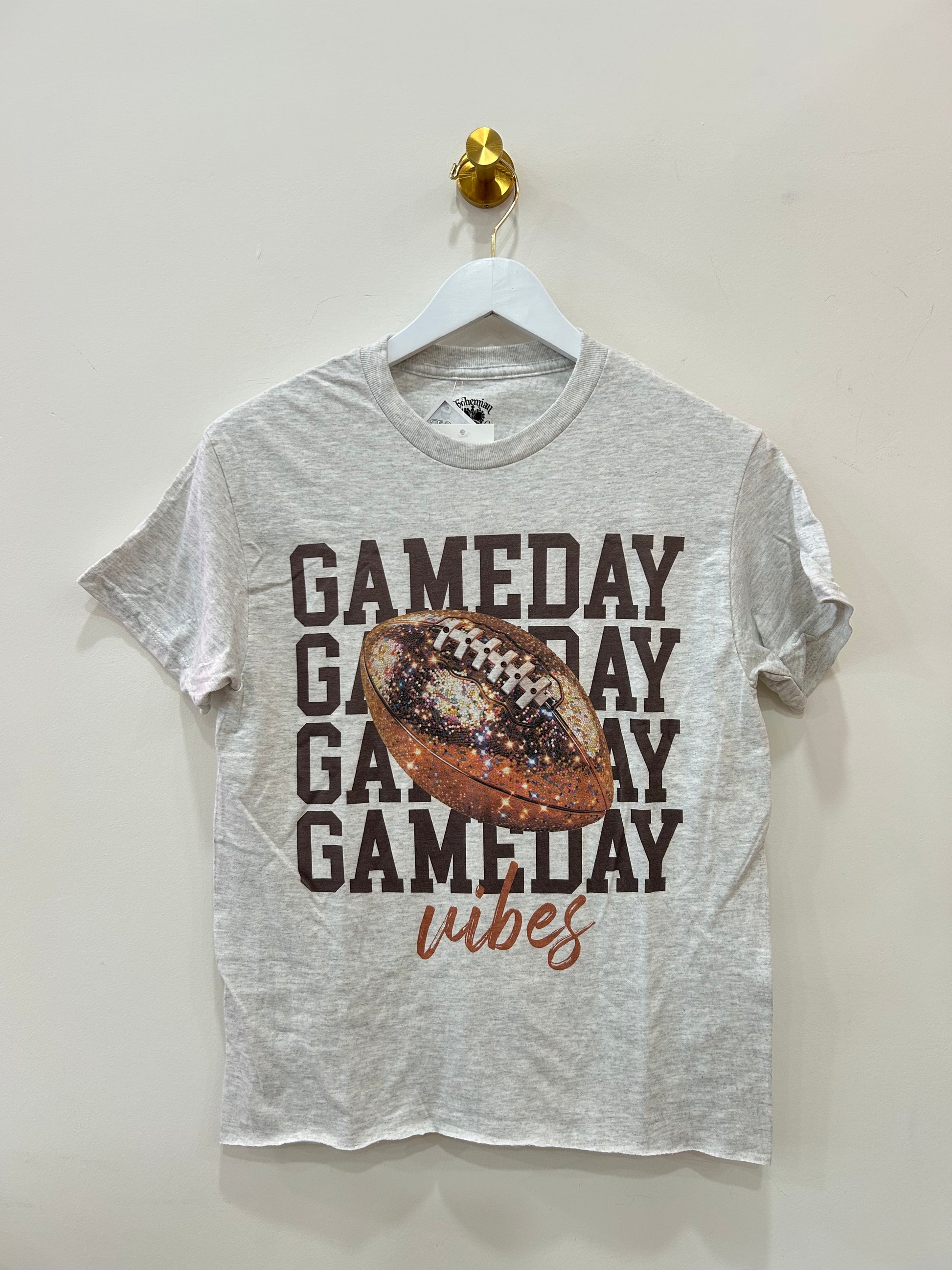 Stone-embellished football graphic on a soft ash gray tee. This game-day essential combines classic styling with refined detailing, perfect for showcasing your team spirit with understated sophistication.
