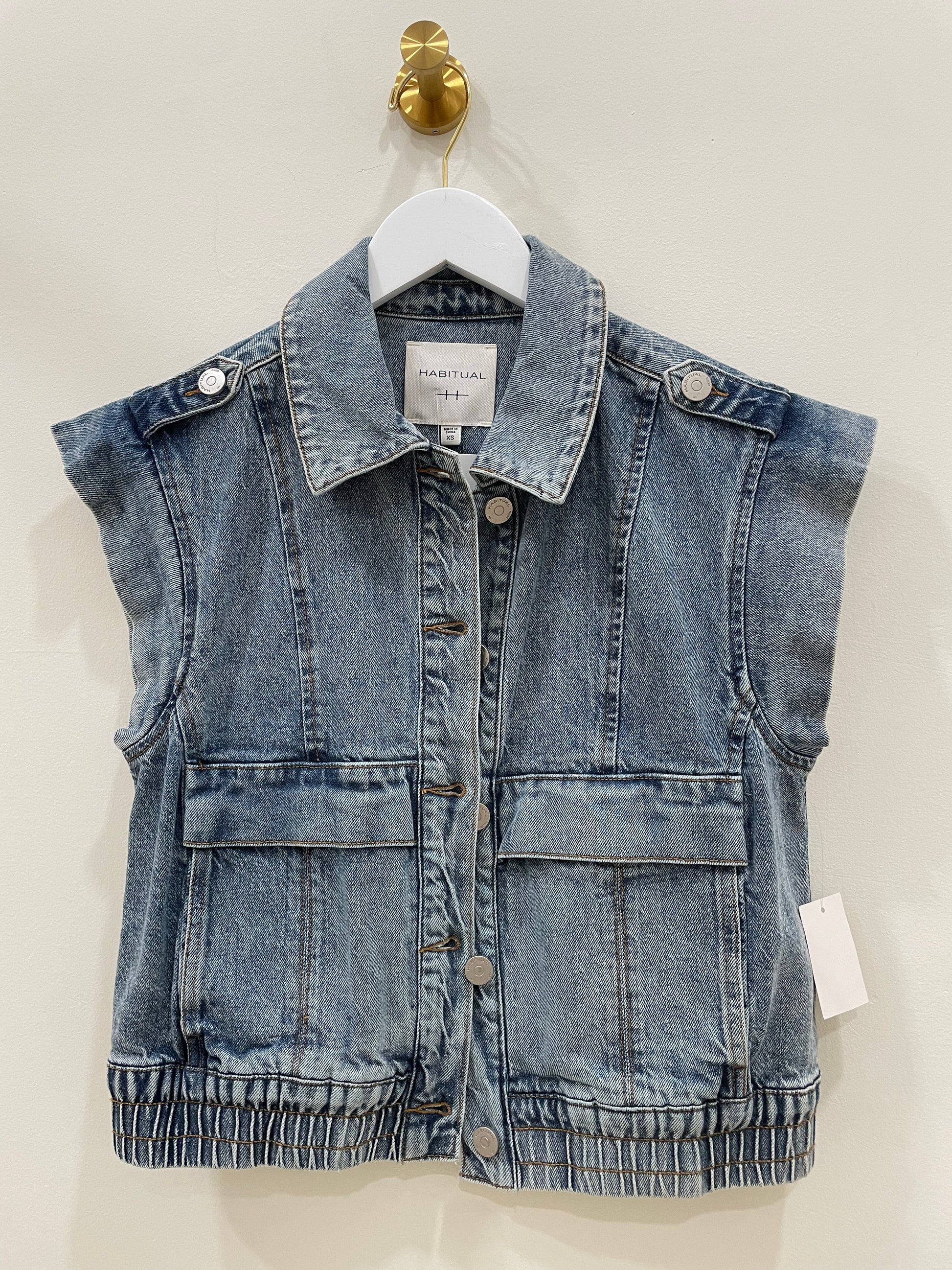 A vest so versatile you can mix and match it with almost any outfit and it will feel brand new every time.Front button closure. Spread collar. Cap sleeves. Front flap pockets. Elastic waist. 97% cotton, 2% rayon, 1% spandex. Machine wash, tumble dry. Imported.